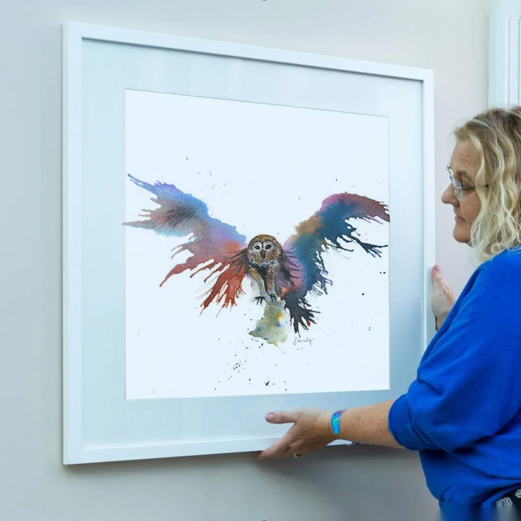 This gallery-quality giclée watercolour print features “First Flight”, a vibrant owl painting reproduced from my original artwork. This piece was one of the first image created at the beginning of my journey to becoming a watercolour artist as a profession, making it especially meaningful.